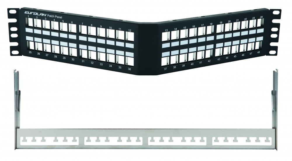 Патч панель угловая 19” наборная, FTP, 2U, 48 портов Keystone, цвет черный.