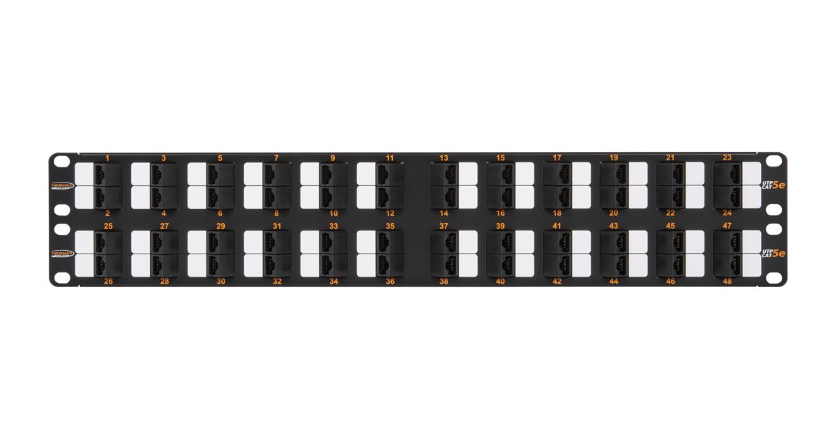 Коммутационная панель NIKOMAX 19", 2U, 48 угловых портов, Кат.5e (Класс D), 100МГц, RJ45/8P8C, 110/KRONE, T568A/B, неэкранированная, с органайзером, черная.