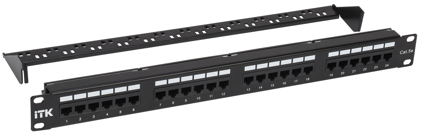 Патч-панель 19" (1U), 24 порта RJ-45, кат. 5e, Dual IDC, с задним кабельным органайзером, 44.5х482х121 мм.