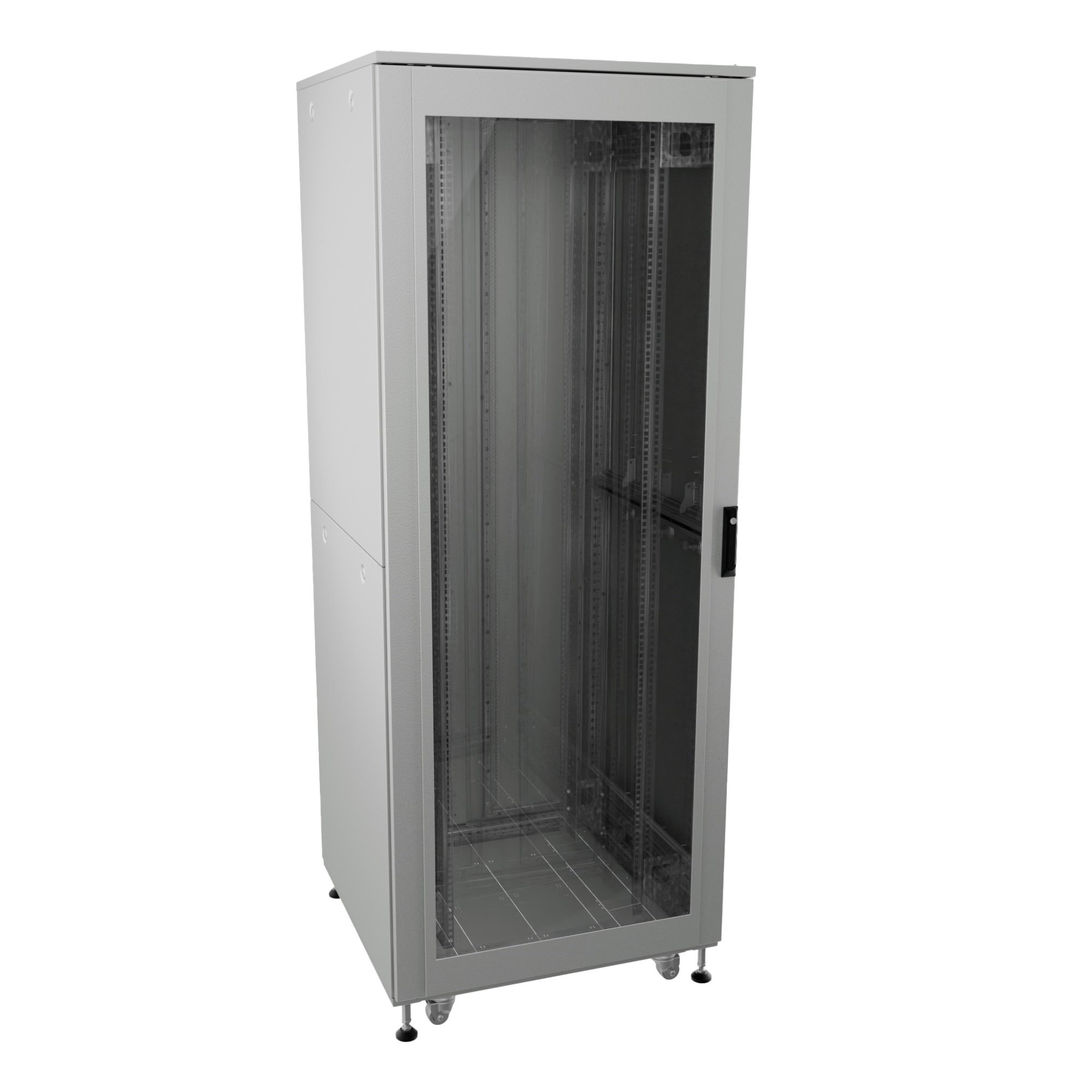 Шкаф телекоммуникационный 19", 32U, напольный, дверь передняя со стеклом, задняя цельнометаллическая, полезная глубина 490 мм, нагрузка статическая до 1500 кг, разборный, цвет серый, 1690х600х600 мм.