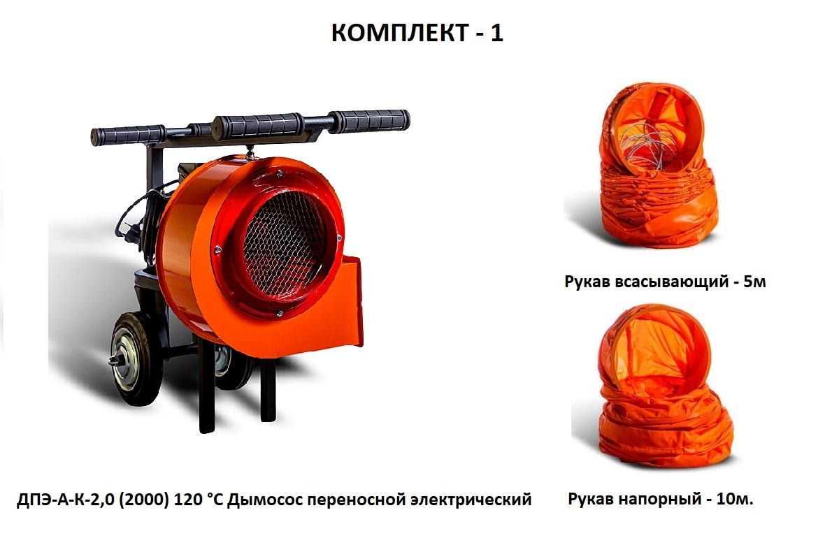 ДПЭ-А-К-2,0 (2000) 120 °С Комплект-1 Дымосос переносной электрический; рукав всасывающий - 5м; рукав напорный - 10м