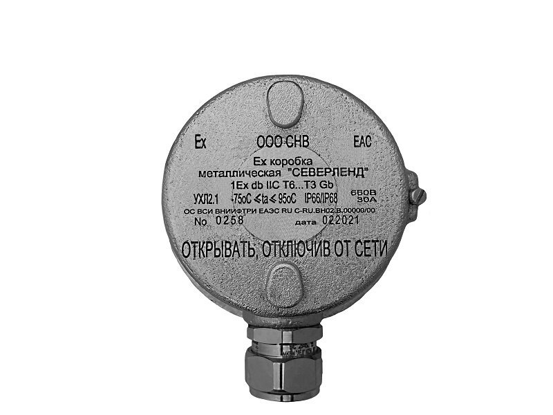 Коробка коммутационная взрывозащищенная, 1Ех db IIC T6...T5 Gb Х/1Ех db IIC T6...T3 Gb Х, алюминиевый сплав Д16Т; IP66/IP68, УХЛ2, t-раб. -75...+195 °С, габ.размеры 117 х 117 х 85мм. Комплектуются пластиковыми клеммниками (14 пар клемм); U-коммут. 660 В, I-коммут. 30 А, S-жилы до 4 мм². Под 1 кабельный ввод (приобретаются отдельно).