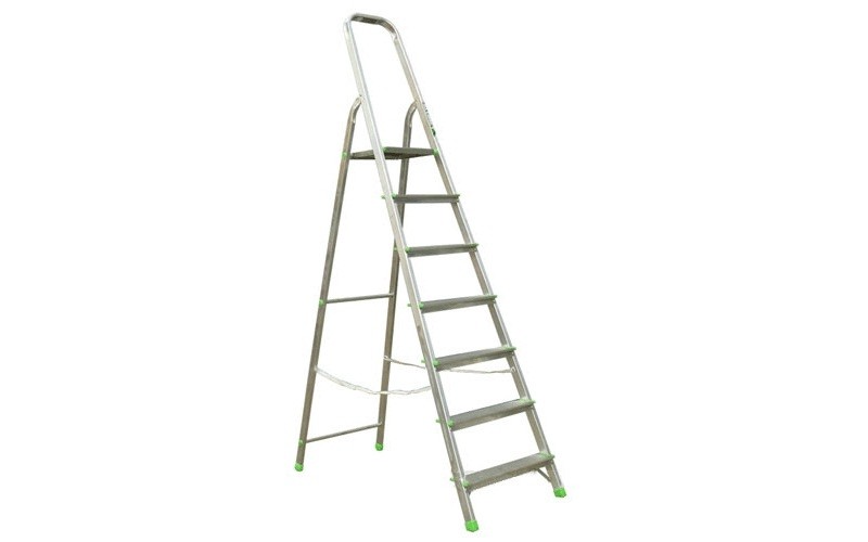 Алюминиевая стремянка АМ707 рассчитана на 150 кг, удобна при проведении монтажных работ, а также в быту и строительстве, легкая, прочная. Имеет широкое устойчивое основание, удобную 80мм рифленую поверхность ступени, предотвращающую соскальзывание стопы, прочную страховочную ленту, удерживающую стремянку в рабочем положении. Площадку с рифлением (она же верхняя ступенька) из оцинкованной стали, дугу безопасности высотой 65 см защищающую от падения.