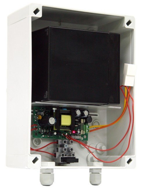 Резервированный источник питания импульсный; U-вх.165…275 В, U-вых.13.4…14.0 В, I-ном.2 А, I-max.2.5 А; под АКБ 12 В 4.5 А·ч; защита от КЗ; IP65, t-раб.-40…+40°С (с термостатом), 159х204х84 мм