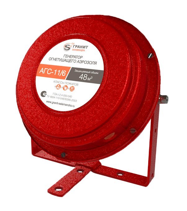 Генератор огнетушащего аэрозоля универсальный с воздушным охлаждением; V-защ. 48.0 м.куб., t-раб. 40 сек., 235х196х217 мм, 4.5 кг. Установка на кронштейн. Вкручиваемый узел запуска.
